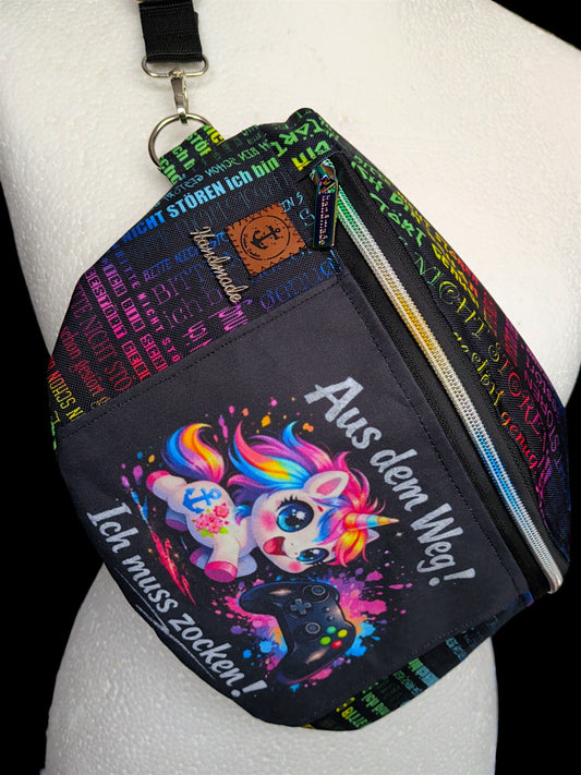 Große Bauchtasche mit Einhorn "Aus dem Weg! Ich muss zocken!"